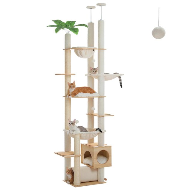 Designed with multiple levels and sturdy platforms, this multi-level cat tower provides plenty of room for several cats to climb, explore, and rest without crowding. Weighing approximately 100 pounds, it stands strong and stable, even during energetic play sessions. The 6-inch thick posts are wrapped in natural sisal rope—perfect for satisfying your cats’ scratching instincts while keeping your furniture scratch-free.