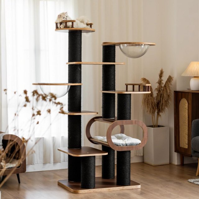 At the top sits a transparent acrylic bed that lets your cat perch high above while observing the world below. It’s the perfect lounging spot for sunbathing, napping, or quietly watching the household bustle. This elevated feature combines function and style, adding a unique architectural flair to your living space.