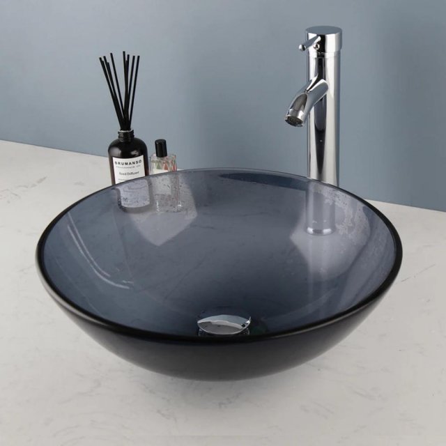 Transform your bathroom into a modern sanctuary with this Grey Round Tempered Glass Vessel Sink & Faucet Set. Designed with a sleek European-inspired aesthetic, this set combines artistic craftsmanship with practical luxury. The transparent grey bowl features a hand-painted finish that makes every piece unique, offering a stunning focal point for any contemporary bathroom.