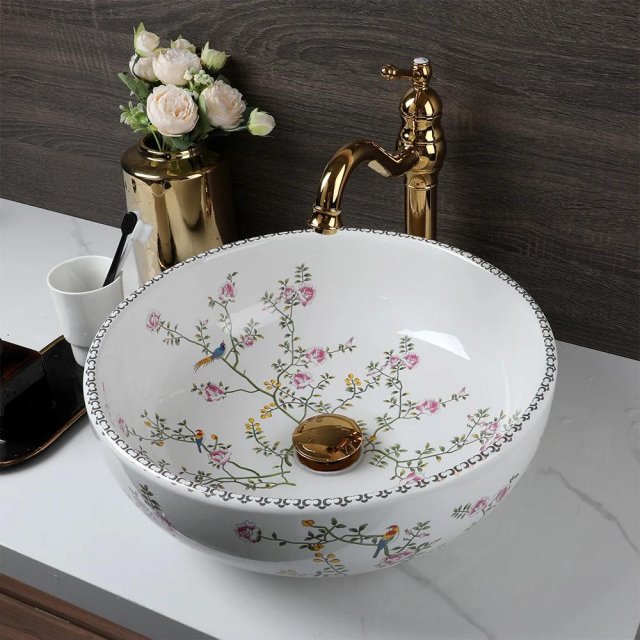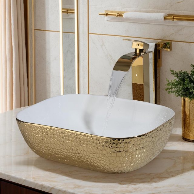 Expertly crafted from high-grade ceramic, this basin is built to last. It’s fired at high temperatures for exceptional strength and finished with a triple-layer glaze that resists scratches, stains, and fading. The smooth surface not only shines brilliantly but also makes cleaning effortless—keeping your bathroom looking fresh and new for years. The matching golden faucet, made from solid brass, delivers reliable water flow while resisting corrosion and tarnish.